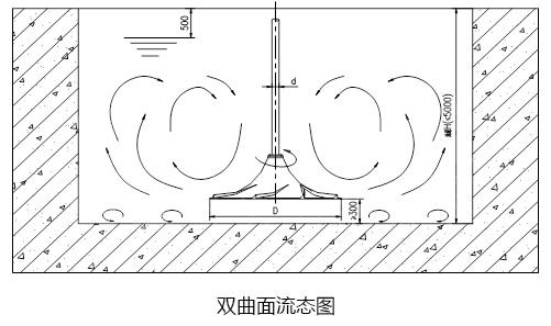 G/Q/FSJ型系列曲面攪拌機(jī)曲面葉輪體上表面為雙曲線母線繞葉輪體軸線旋轉(zhuǎn)形成的雙曲面結(jié)構(gòu),其特有的葉輪結(jié)構(gòu)設(shè)計(jì),較大限度地將流體特性與機(jī)械運(yùn)動(dòng)相結(jié)合。雙曲線的方程為xy=b曲線沿y軸旋轉(zhuǎn)而構(gòu)成的曲面體;為了迎合水體流動(dòng),設(shè)計(jì)從葉輪的中心進(jìn)水,這一方面減少了進(jìn)水紊流,另一方面保證了液體對(duì)葉輪表面的壓力均勻,從而保證整機(jī)在運(yùn)動(dòng)狀態(tài)下的平衡。在漸開雙弧面上均布有八條導(dǎo)流葉片,借助液體自重壓力作補(bǔ)充進(jìn)水獲得的勢(shì)能與葉輪旋轉(zhuǎn)時(shí)產(chǎn)生的離心力形成動(dòng)能,液體在重力加速度的作用下經(jīng)雙曲面結(jié)構(gòu)過渡沿葉輪圓周方向作切線運(yùn)動(dòng),在池壁的反射作用下,形成自上而下地循環(huán)水流,故可獲得在軸向(y)和徑向(x)方向的交叉水流(如雙曲面流態(tài)圖)。