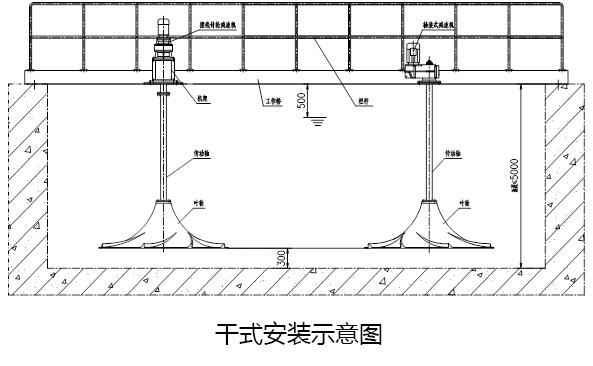 干式安裝的攪拌機(jī)先將減速機(jī)機(jī)架固定在工作橋上,然后只需依次安裝傳動(dòng)軸,葉輪部件,并固定好電纜,見干式安裝示意圖。