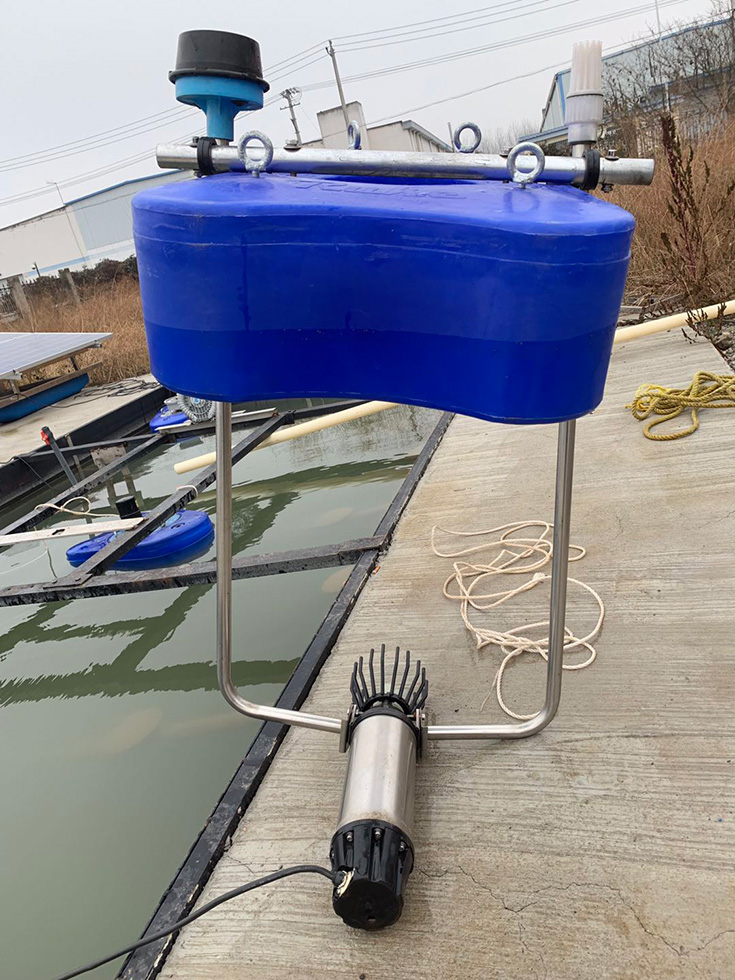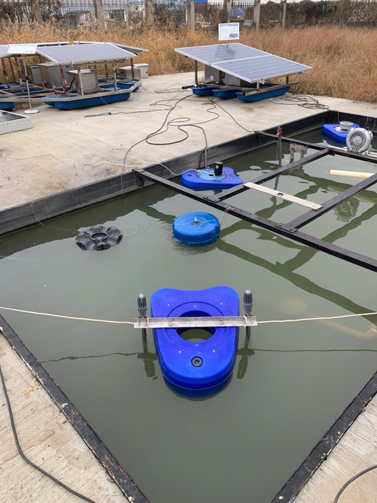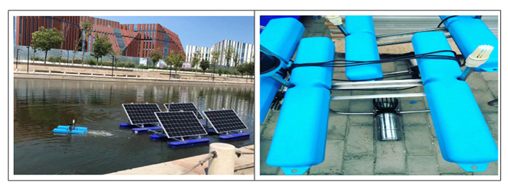 漂浮式安裝方式適應范圍廣,安裝維護方便,不受水位變化影響,適應水深大于 0.8m,有插桿、錨固和駁岸牽拉三種固定方式。根據(jù)要求隨時移動,整個設備只有少量浮體露于水面,對水面景觀影響小,配合人工浮島,起到水上綠化,美化水體效果。
