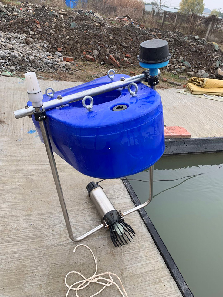 沉水式安裝方式,適應于水深 0.6-1m,且水位變化小于 0.3m 的水域。放置在指定位置無需固定,同時可根據(jù)要求進行移動。整個設備有進氣口露于水面,對水面景觀無影響。