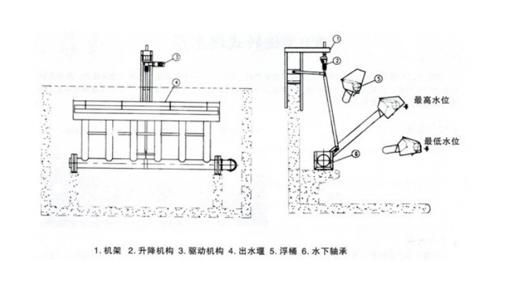 XB潷水器由潷水裝置、傳動(dòng)裝置、撇渣浮筒裝置及回轉(zhuǎn)支承等組成。驅(qū)動(dòng)機(jī)構(gòu)通過(guò)可伸縮推桿帶動(dòng)潷水裝置及撇渣浮筒裝置繞回轉(zhuǎn)支承旋轉(zhuǎn),從而使?jié)呖谏舷乱苿?dòng),達(dá)到潷出上清液的目的XB-L型旋轉(zhuǎn)式潷水器由集水槽、浮筒、排水管組、回轉(zhuǎn)支座、螺桿、連桿裝置、導(dǎo)軌及傳動(dòng)裝置組成。XB-D 型旋轉(zhuǎn)式潷水器主要由集水槽、浮筒、排水管組、回轉(zhuǎn)支座、電動(dòng)推桿及電控箱等組成。XB-F型旋轉(zhuǎn)式潷水器主要由集水槽、浮筒、排水管組、電磁閥、液位計(jì)及電控箱等組成。