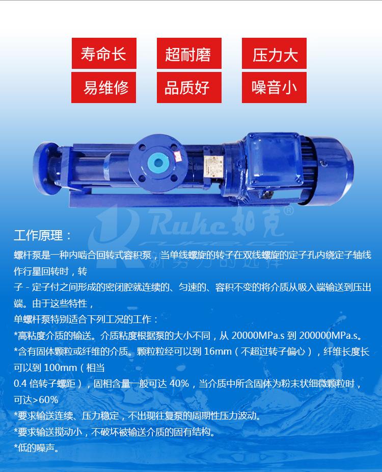G系列螺桿泵是一種內(nèi)嚙合的密封式螺桿泵,屬轉(zhuǎn)子式容積泵。單螺桿泵輸送介質(zhì)時擾動小、泵壓穩(wěn)、吸入性能好,可以輸送粘稠的非牛頓液體及含有機(jī)械雜質(zhì)和固體顆粒的濃縮物,泵量調(diào)節(jié)性能好,效率高且高 效區(qū)寬。適用于輸送介質(zhì)溫度-10℃~80℃(泵可達(dá) 150℃)、粘度 20000~200000MPa.s 的所有工業(yè)部門??蓮V泛用于原油、污油、礦漿、泥漿、化工和化纖漿液、膠水、涂料、糖漿、果醬、化妝品以及濃縮污水等介質(zhì)的輸送。