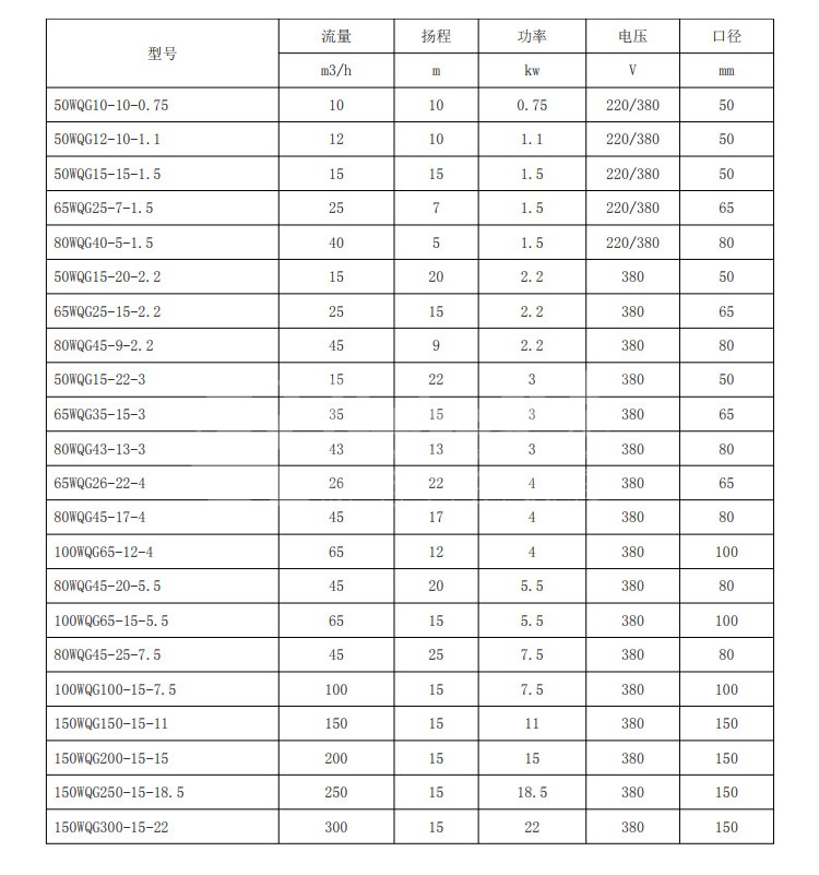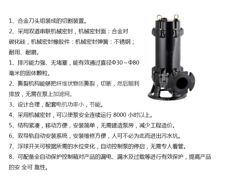 WQG 型切割污水泵整體設(shè)計(jì)合理,配套電機(jī)合理,帶有熱保護(hù)裝置,效率高,節(jié)能,廣泛應(yīng)用于企業(yè)單位、工廠、住宅區(qū)的污水排水站,也可用于化糞池、沼氣池的污水排放。WQG 型切割污水泵結(jié)構(gòu)緊湊,體積小,移動(dòng)方便,安裝簡(jiǎn)便,無(wú)需建泵房,潛入水中即可工作,大大減小工程造價(jià)。另外可根據(jù)客戶實(shí)際使用情況,配置全自動(dòng)安全保護(hù)控制柜和浮球開(kāi)關(guān),自動(dòng)控制 WQG 型切割污水泵的啟停,保證了泵運(yùn)行可靠。