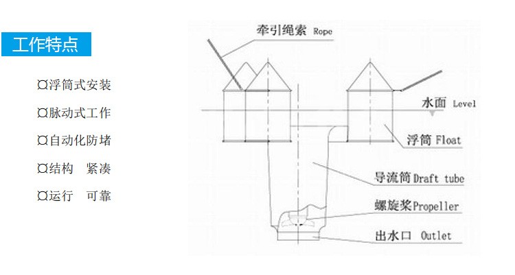 該機主要由浮筒、導流筒、潛水電機和螺旋槳等部件組成,導流筒借助浮筒的浮力呈豎直方向懸浮在水面下,吸口朝上,貼近水面,出水口向下。當電機驅(qū)動葉輪高速旋轉(zhuǎn)時,導流筒吸口上方附近的浮泥連同水被吸入導流筒,在葉輪的作用下經(jīng)破碎后從導流筒出口泵出,被送入水下。由于浮泥中的空穴被水填充后,其比重大于污水的比重,泵入水下后將不 再上浮。