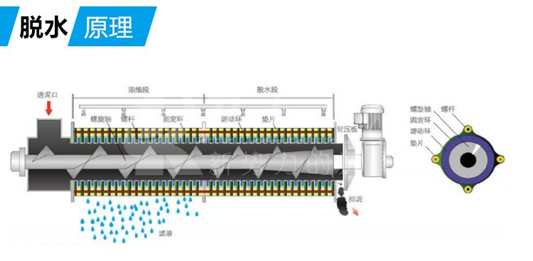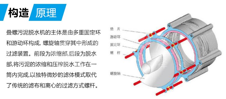疊螺污泥脫水機是運用了螺杄擠壓原理,通過螺杄直徑和螺距變化產(chǎn)生的強大擠壓力,以及游動環(huán)和固定環(huán)之間的微小縫隙,實現(xiàn)對污泥進行擠壓脫水的一種新型固液分離設(shè)備。