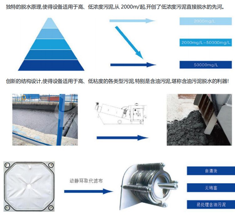 泛使用于市政污水、食品、飲料、屠宰養(yǎng)殖、印染、石油化工、造紙、皮革、制藥等各行業(yè)的污泥脫水。