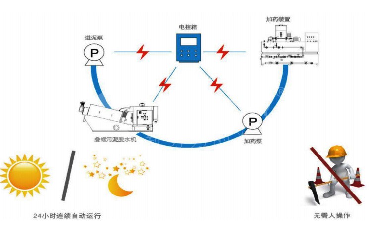 疊螺污泥脫水機從泵送污泥,加入藥液,排出泥餅均采用自動控制,通過電控柜,加藥裝置,進泥泵,加藥泵等進行聯(lián)動,不需人員操作設(shè)備,運行不會發(fā)生堵塞、濾帶走偏或其他影響工藝安全的現(xiàn)象,日常保養(yǎng)維護簡更,可以 24 小時無人連續(xù)運行。第一次真正意義上實現(xiàn)了污泥脫水連續(xù)全自動運行。