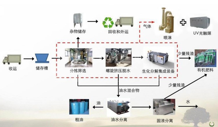 餐廚垃圾、菜場(chǎng)果蔬垃圾和蔬菜基地果蔬垃圾分別經(jīng)由專用密閉運(yùn)輸車輛輸送至處理站,直接卸入卸料/分揀平臺(tái),經(jīng)人工分選將其中的塑料和紙質(zhì)包裝類垃圾以及少量玻璃瓶、金屬物料、磚瓦等無機(jī)物料分選出來后,進(jìn)入破碎機(jī)破碎至 1-3cm 一下,然后進(jìn)入螺旋擠壓脫水機(jī)進(jìn)行脫水處理,脫除下來的滲濾液進(jìn)入油水分離,經(jīng)過處理排入污水管道。擠壓產(chǎn)生的含固率在 40%以上的干物料經(jīng)由皮帶輸送機(jī)送入高溫好氧發(fā)酵倉內(nèi)進(jìn)行高溫好氧發(fā)酵處理。物料在高溫好氧發(fā)酵倉內(nèi),通過強(qiáng)制通風(fēng)與內(nèi)部攪拌翻堆相結(jié)合的方式,保證氧氣充分供給,以使物料中的揮發(fā)性有機(jī)質(zhì)降解效率達(dá)到 70%以上,確保處理后產(chǎn)物充分腐熟,以使物料中的寄生蟲(卵)、病原菌,病毒等充分滅活,高溫好氧發(fā)酵倉出料經(jīng)由出料口排出。高溫好氧發(fā)酵倉內(nèi)產(chǎn)生的高濕、高溫和高污染惡臭氣體,排入氣體凈化箱進(jìn)行凈化。