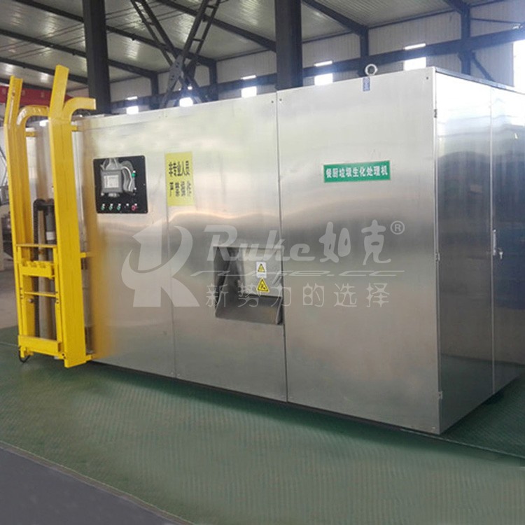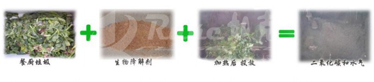在設(shè)備內(nèi)預(yù)先投入的菌種,通過攪拌混合及適當(dāng)?shù)臏囟忍峁┚N適合繁殖的條件,在細(xì)菌繁殖的過程中將餐廚垃圾中的脂肪、蛋白質(zhì)、淀粉等物質(zhì)分解成水和二氧化碳,之后只剩下較少數(shù)殘?jiān)倪@一過程,就是餐廚垃圾的處理過程。