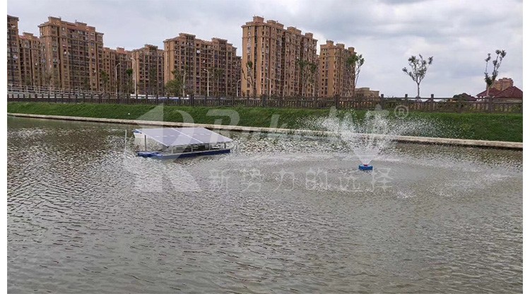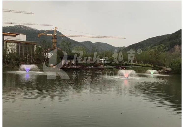 b)促進水循環(huán),賞心悅目,循環(huán)效果佳,懸浮于深水中的增氧機吸入下層的貧氧水再從噴頭形成噴泉噴向空中,分散成大小不等的水滴,增加了豐富的溶解氧;